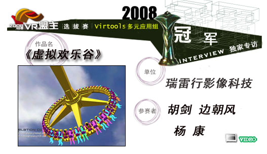 此次多元组冠军作品为《虚拟欢乐谷》,本届多元组参赛作品较2006年作品从数量和质量上均有所提升,决赛评委普遍认为2008年多元组的作品更具有实际指导意义,部分作品更具有商业开发的前景。而《虚拟欢乐谷》的成功在于从创意性、实用性、技术性三方面综合实力突出,得到专家评委的一致认可,评委认为胡剑团队的作品较其他作品更具有真实感,同时能将大量真实的贴图压缩成小的文件,在速度和质量方面得到了完美的平衡,将Virtools的强大功能完全的展现出来。